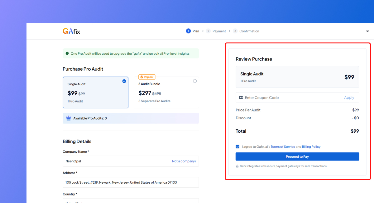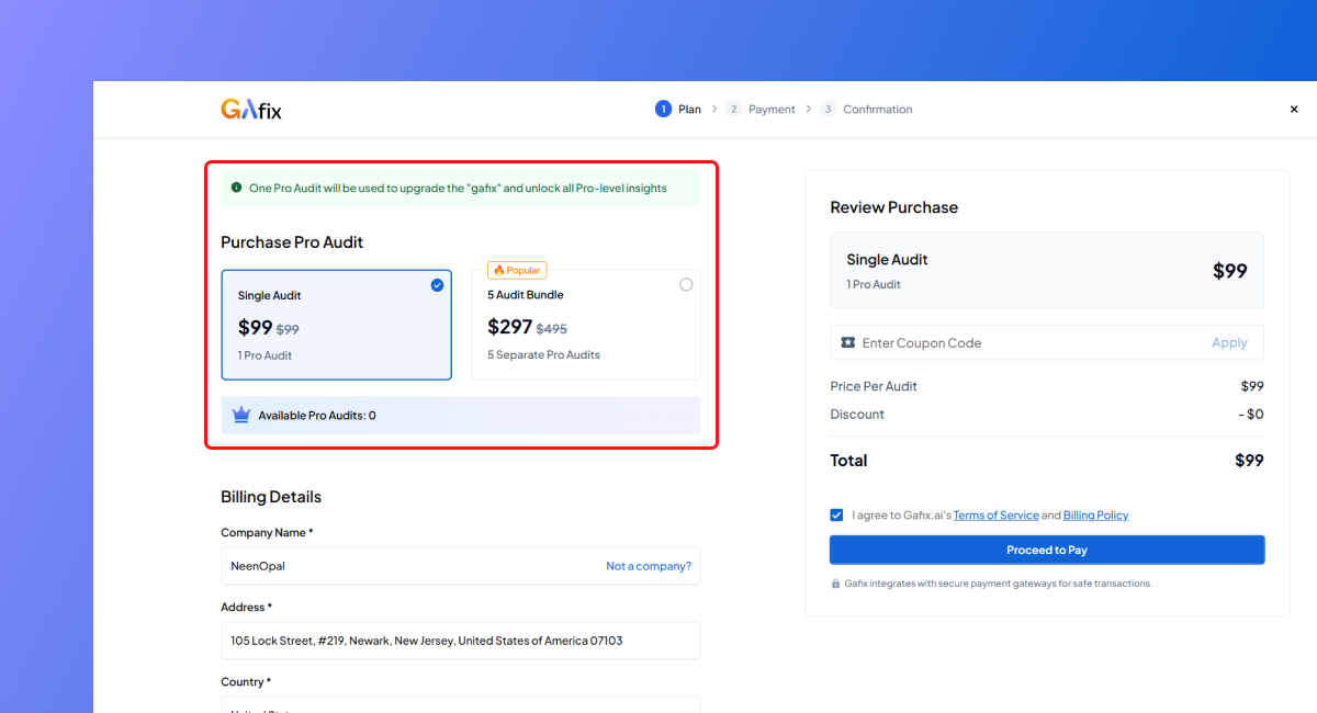 - After selecting your preferred Pro plan (either 1 audit or a 5-audit bundle), you’ll be taken to the billing form.